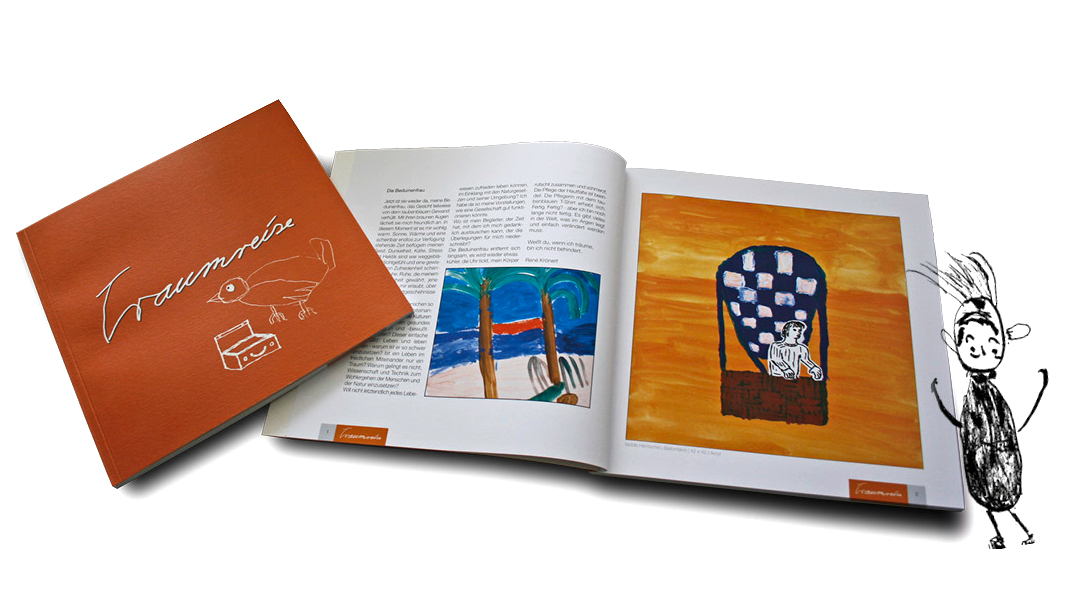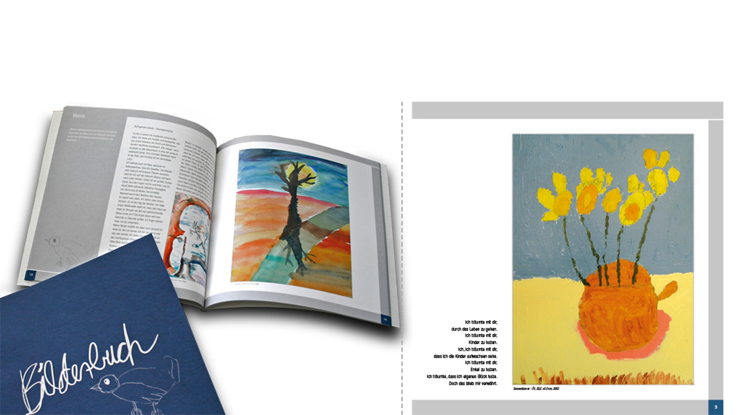 Aud dem Vorwort: "Unser „Bilderbuch“ besteht nicht nur aus bebilderten Seiten, nein, wir kommen auch zu Wort. Wir sind körperlich schwerstbehinderte Jugendliche und Erwachsenen, die im ASB Wohnzentrum - Rembrandtstraße leben und wohnen. Daher nennt man uns die „Rembrandtkünstler.“ In den vergangenen vier Jahren sind Bildarbeiten entstanden, deren Entstehungsprozess Mica begleitet hat. Aufgrund unserer Behinderungen sind unsere motorischen Fähigkeiten zum Teil sehr eingeschränkt. Einen Stift oder Pinsel in die gewünschte Richtung und im gewünschten Maß zu führen, erfordert hohe Konzentration, Kraft und Ausdauer. Manche von uns sind beim Malen oder Zeichnen auf permanente Hilfe angewiesen. Wir können nicht alle so genau greifen, so dass uns jemand den Stift in unsere Hand, zwischen die Finger schieben muss. Oder einen Pinsel auswaschen, oder das Papier in die gewünschte Position drehen, oder unsere Hand stützen, weil wir keine Kraft haben, die Hand im gewünschten Abstand zum Malgrund zu halten ... Wir wollen mit dem „Bilderbuch” endlich unsere Bilder zeigen und unsere Worte sagen. (Die Rembrandtkünstler)"